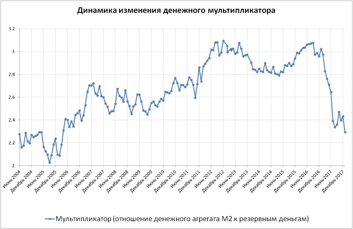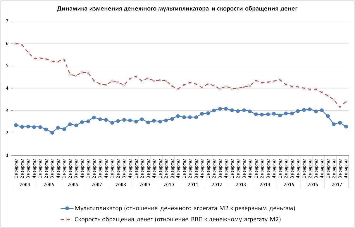 Более того, изменение показателя скорости обращения денег и денежного мультипликатора также свидетельствует об изменчивой динамике данных показателей, что может привести к искажению при разработке целевых показателей денежных агрегатов.