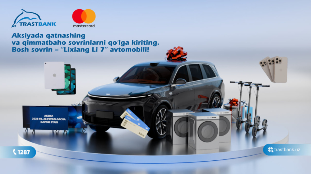 * Aksiya sovrinlari ro‘yxatiga “Trastbank” xususiy aksiyadorlik banki boshqaruvining 2025-yil 31-oktabrdagi PR164-sonli qaroriga muvofiq o‘zgartirish kiritildi. Unga ko‘ra tasdiqlangan Nizomning 4-§ “a” bandida keltirilgan sovrin AQShga 1 dona ikki kishi uchun 10 kunlik sayohat yo‘llanmasi (bunda Bank ikki tomonga aviabilet va mehmonxona xarajatlarini o‘z zimmasiga oladi, elchixonadan viza olish xarajatlari esa yutuq egasi zimmasiga tushadi) sovriniga almashtirildi.