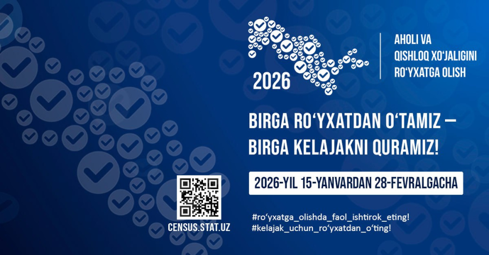 O‘zbekiston Respublikasida 2026-yil 15-yanvar — 28-fevral kunlari aholi va qishloq xo‘jaligini ro‘yxatga olish tadbiri o‘tkaziladi. Bu – mamlakatimizdagi har bir fuqaro va xo‘jalik haqida aniq maʼlumot to‘plash, kelgusidagi ijtimoiy-iqtisodiy rejalarni belgilashda muhim qadam hisoblanadi.